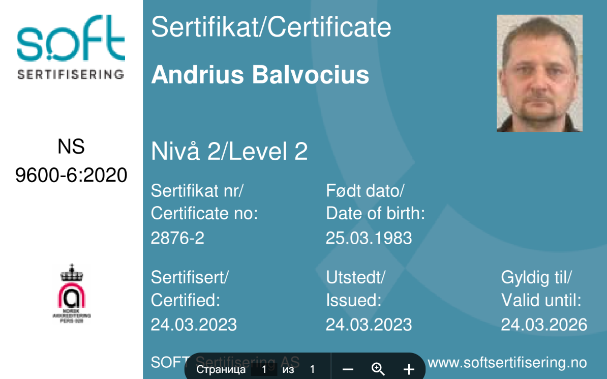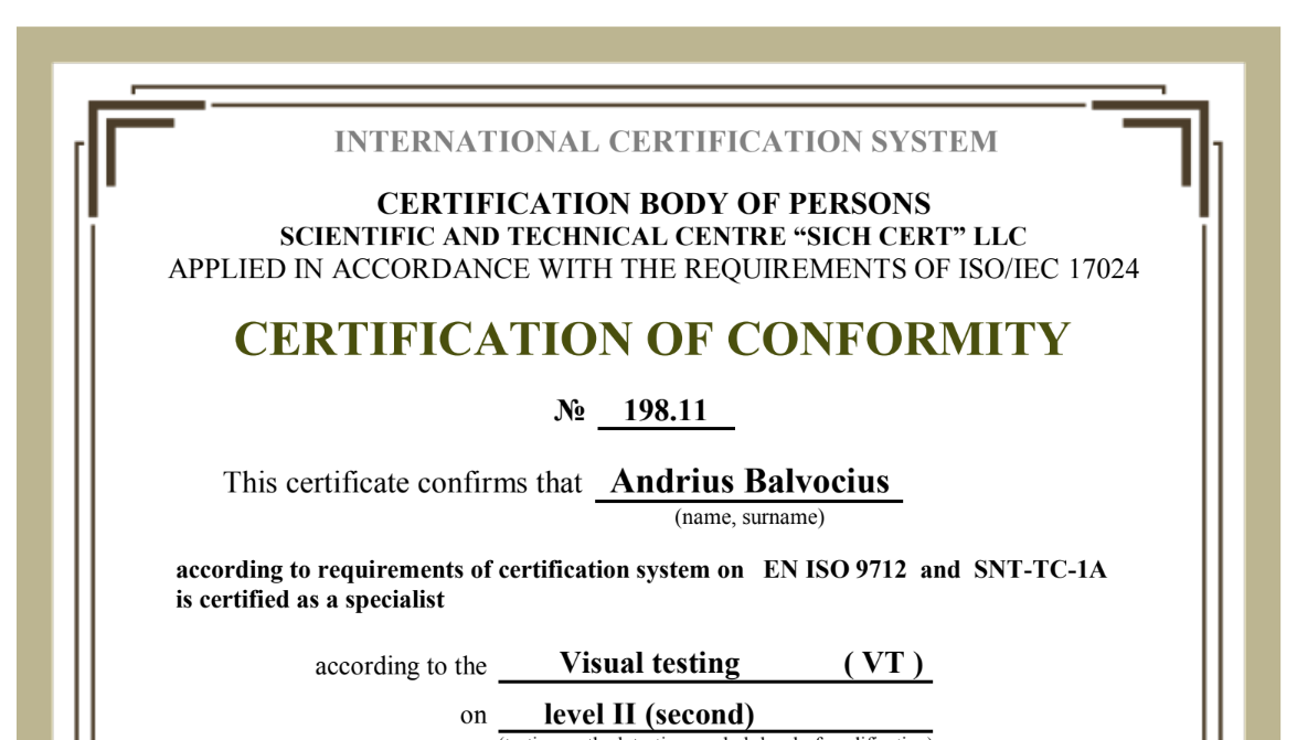 NDT certificates Level 2: VT, MT, ET, PT, UT;